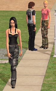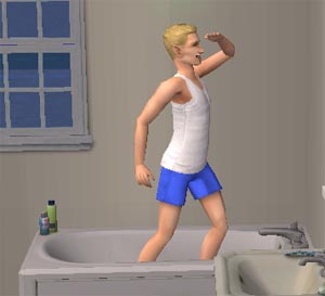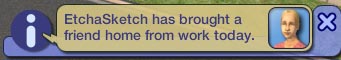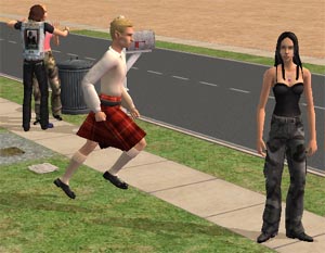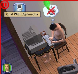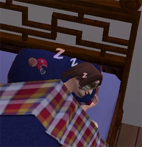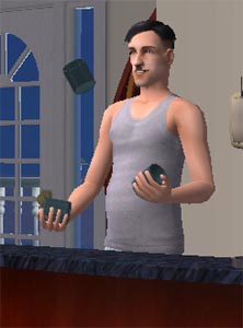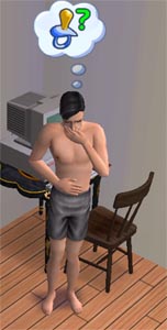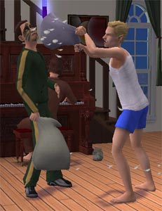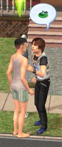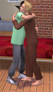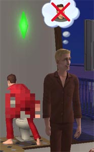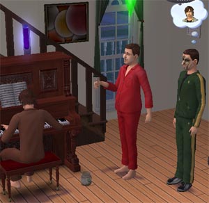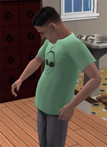 Day 5Here's Rathen, clear on keeping his options open... Etcha mopped up the bathroom. What a contradiction in nature yet again as he defies his sloppiness standard. I am just not getting over this. I intervene. It's time to finish out Rathen's 'surprise', so I have him call for a taxi, and have him visit the clothing store. The transaction is complete! Poor Rathen is hungry so we'll save the wardrobe adjustment for a little bit. I would ruthlessly taunt FG for playing with dolls, except it *is* the toy geared towards group activity, and popularity, which, in another art-imitates-life moment, seems to be his real-life hang up anyways. Oh Christ... be careful GIIRyudo, the telescope's what got Rathen knocked up... Suddenly, the camera jerks back to Rathen. Oh fuck, what the hell is happening now. Aw hell. Looks like Rathen's entering his second trimester. The 'surprise' will have to wait until he fits into it. What an interesting 'maternity' outfit. Holy crap. EtchaSketch leaves for work on time. And FG puts the dolls down, and totally douches the kitchen. I wasn't fast enough to screenshot it, but he went upstairs, made up 3 beds, then finally crashed out. AWWW~ Aww, more sweetness- Otik doesn't want Rathen abducted by aliens any more. First day of school! Promoted or not, Duey and Ob still pile into a wretched piece of shit for a carpool. EtchaSketch comes home from work... Oh snap, what is this? After slapping Jan(said friend from work)'s hands away for trying to tickle (what a bitch! ...EtchaSketch in case there's any confusion), look who's visiting! Our first Dramabomb, Nobuu! She promptly blows right past them. SPRINTING to greet her, is Otik! Kilts afire! Note the hug rejection for Etcha in the background. Looks like Etcha's regaining his footing, however. And, I am fucking pissed. Another FRAPS dropped frame. Otik and Nobuu chill on the couch to some supremely annoying television. Etcha and Jan hang out by the trashcan chatting for around two hours. It's the place to be! Rathen pops out and pays bills. Etcha greets him. I believe the conversation here could be summed up to, "Congratulations you fucking freak!" Yeah, great place to read the paper, chief. The workers return home. ObMeiste was promoted to 'Rookie' and hauled in a lovely bonus. Oh SHIT look at the men go! Otik heads upstairs with Nobuu keeping him on her mind, and EtchaSketch breaking the touching barrier in the back! It may not be a base, but SOMEONE is on deck. Ok, fuck you FRAPS. Etcha's backrub, and the men's house's first kiss were not capped. I want to punch this program in the fucking neck. FRAPS apparently really fucked up and dropped a lot of great moments. So, instead of killing someone, I'm going to wrap it up with the last pic that the fucking thing managed to successfully grab. Etcha hops into his pj's and hits the piano. Just about every passer-by approves. And that finishes off day 5. | Day 6 What in the fuck. It's a fucking Cheers episode, now. This was as random as it looks. What in the FUCK?! FG asks the only guy he knows of that wears a skirt for make-up tips. Otik helps FG with his homework. ObMeiste gets another promotion. Must be a trade-off for neglecting his son. Duey gets promoted, and that's really just about time. GIIRyudo gets a promotion too. The total haul for the house today was around 2,000 bucks. Sweeet. The phone rings, Rathen answers... and it's Marisa! For him! Sweet! It's the pregnant juggle! Details of note- - Rathen's wants shift around but he's always got Marisa on his mind. | |